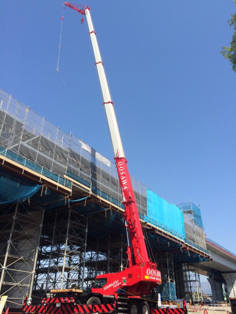 御殿場市を横断する第二東名工事では大沢重機の赤いクレーンが誠意作業中です!